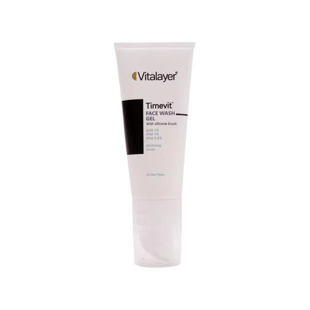 ژل شستشوی صورت ویتالیر مدل تایم ویت حاوی سورفکتانت های ملایم غیر صابونی و اسیدهای PHA، AHA، BHA بوده که ضمن پاکسازی پوست از آلودگی ها و چربی ها با خاصیت لایه برداری ملایم موجب شفافیت و شادابی پوست می شود. این ژل شستشوی صورت برای انواع پوست فرموله شده و براش سیلیکونی آن با نفوذ به داخل منافذ پوست به پاکسازی عمیق آن کمک کرده و با افزایش گردش خون مویرگی موجب افزایش الاستیسیته پوست موجب سلامت آن می شود.