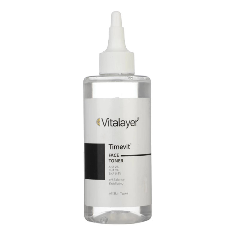 تونر تایم ویت ویتالیر با بهره مندی از برخی آلفا هیدروکسی اسید ها (AHA)، بتا هیدروکسی اسید ها (BHA) و پلی هیدروکسی اسید ها (PHA) به صورت ملایم پوست را لایه برداری نموده و در اصلاح و یکنواخت شدن رنگ پوست موثر است.