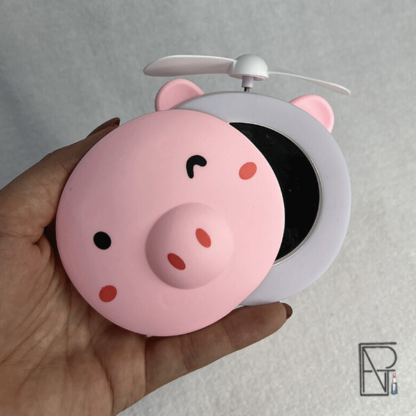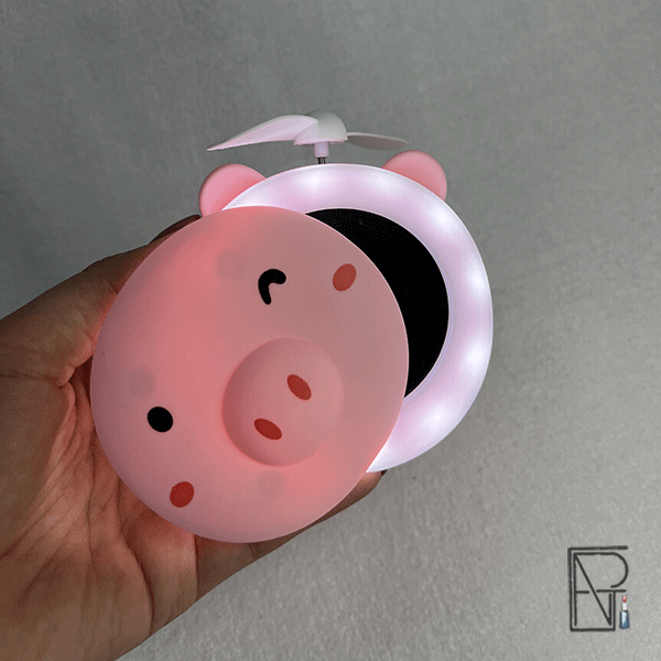 مینی فن طرح خوک شامل آینه – رینگ لایت – فن خنک کننده که فن خنک کننده برای خشک نمودن سریع میکاپ و آرایش قابل استفاده می باشد و هم برای خنک نمودن و هم خشک نمودن سریع آرایش استفاده می گردد.