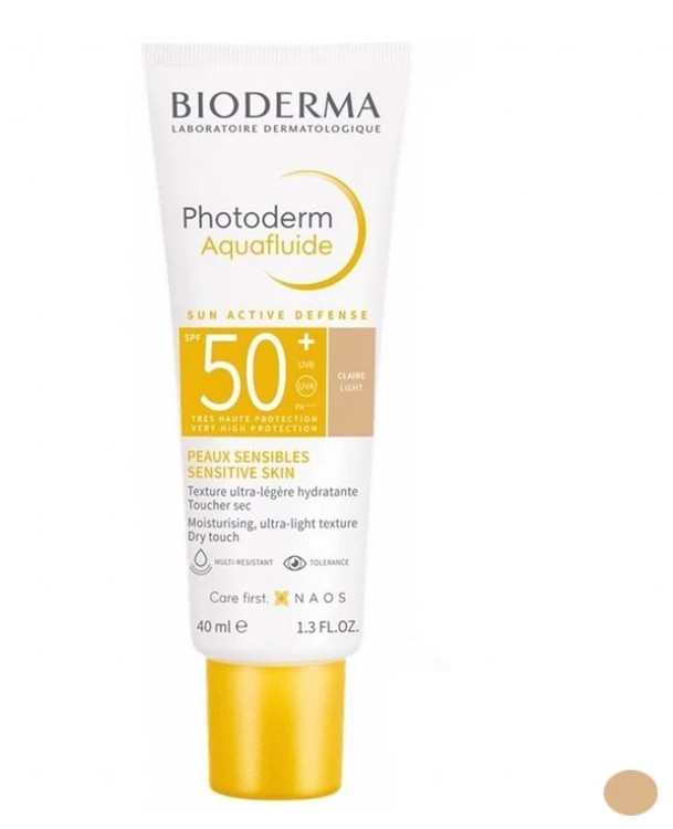 فلوئید ضد آفتاب رنگی آکوا فلوئید بایودرما مدل +Claire Light SPF 50 ضد آفتابی رنگی با بالاترین محافظت در مقابل اشعه آفتاب همراه با بافت فلوئیدی بسیار سبک همچون آب، با جذب سریع و بدون ایجاد حس چربی بر روی پوست است. این فلوئید ضد آفتاب از برند بایودرما مناسب پوست های حساس و کم تحمل در برابر آفتاب، پوست بسیار روشن و دارای کک و مک و انواع پوست ها حتی پوست های چرب و مختلط می باشد. از مزایای این فلوئید محافظتی بسیار قوی روزانه، فرمولاسیون فاقد چربی و عدم براق شدن پوست با جذب سریع است که موجب شده انواع پوست حتی پوست های چرب و مختلط به راحتی از آن استفاده کنند. ضد آفتاب Aquafluide بایودرما جهت استفاده قبل و بعد از شنا و فعالیت های ورزشی محصولی ایده آل است.